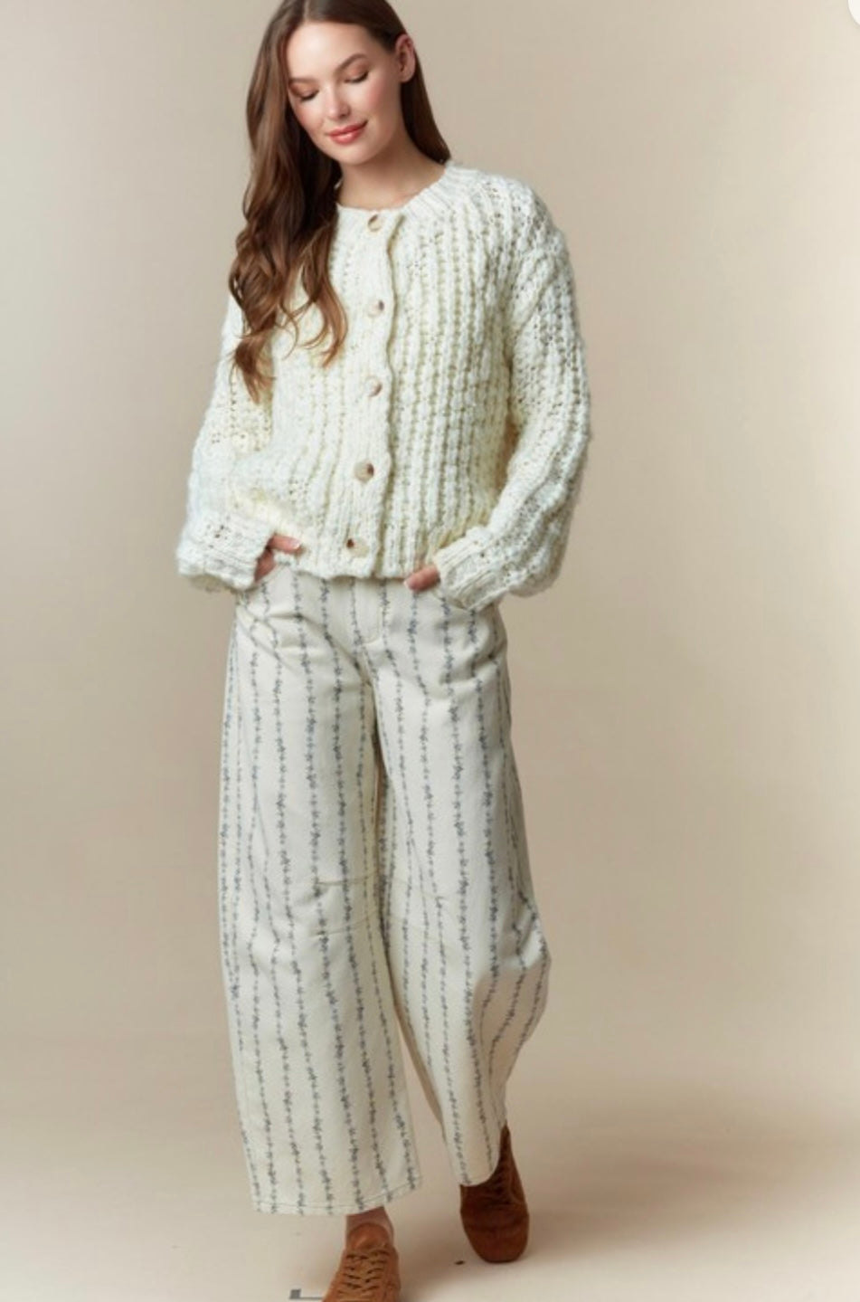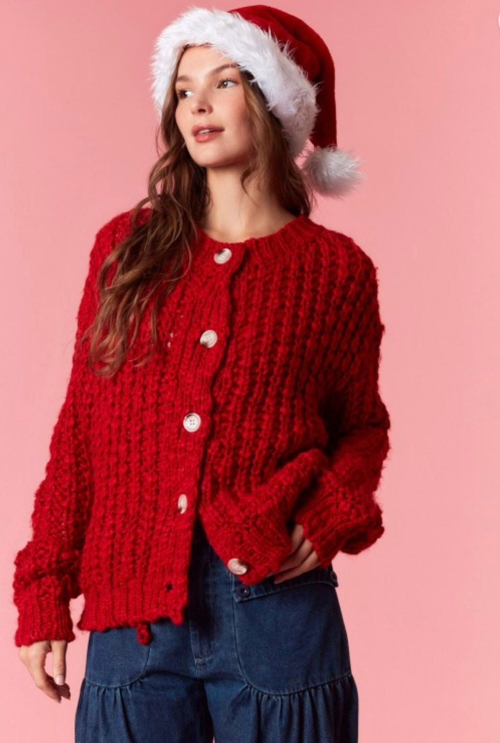 Stay cozy and stylish in our red and cream front button down cardigan. Its classic design and soft fabric will keep you warm and comfortable all day long. Effortlessly elevate any outfit with this versatile and timeless piece.